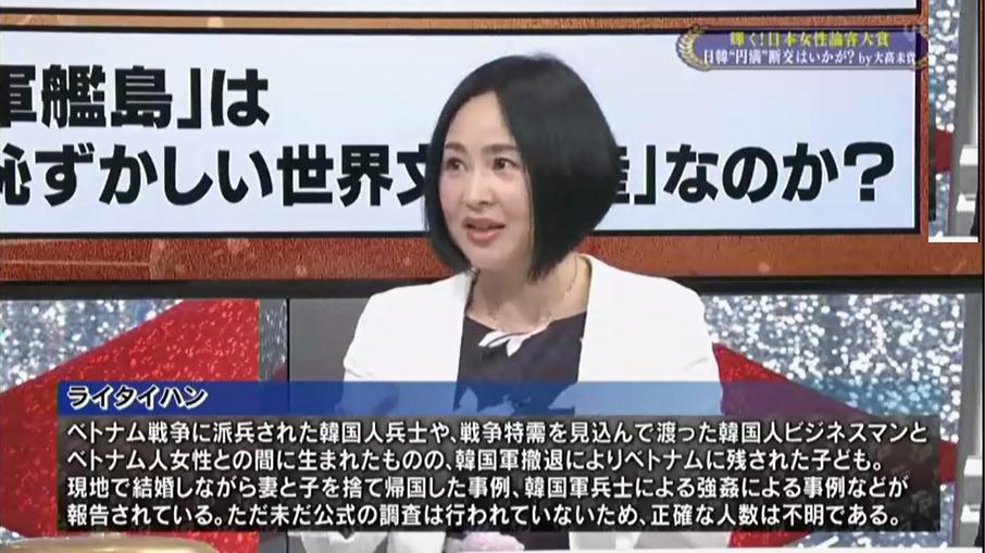 あわせて大高氏は「(韓国は)いたいけな10代前半の少女が日本軍に拉致されて慰安婦にさせられたというフィクションを世界に喧伝している」と述べた。大高氏とともに出演したある男性パネラーは元祖慰安婦像の写真が公開されると、「お乳垂れてますね」という妄言を吐いた。すると大高氏は「少女ではありませんから」と説明を加え、観覧席からは笑いの声が上がった。