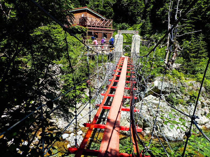 そんなこんなで黒部川をまたぐ小さな吊り橋を渡って(写真3枚目)山を登り返して稜線に出ると、薬師岳が出迎えてくれます