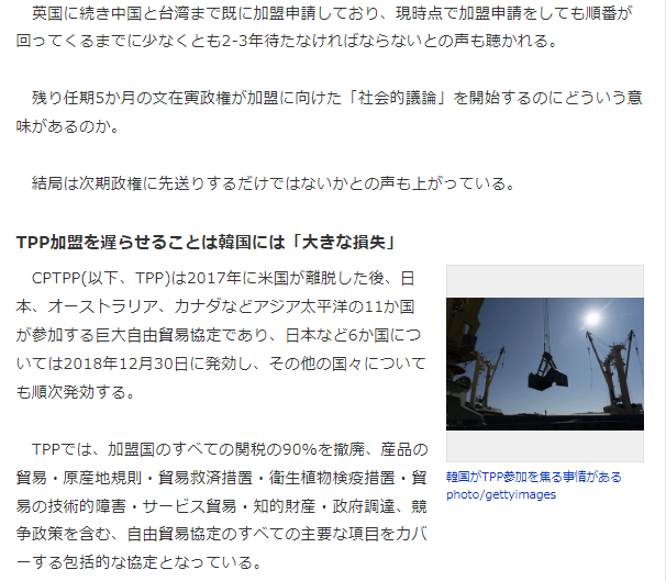 さらに、地域の自由貿易を通じ市場の多様化とサプライチェーン強化に役立てることができる。特に過度に高い対中依存度を下げることができる。TPPに加入していない国の企業は原・副資材供給など多様な側面で不利益を受ける可能性がある。>>117