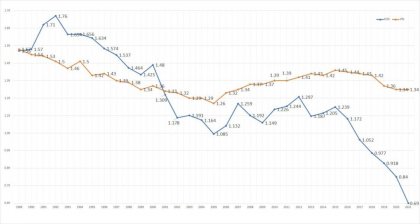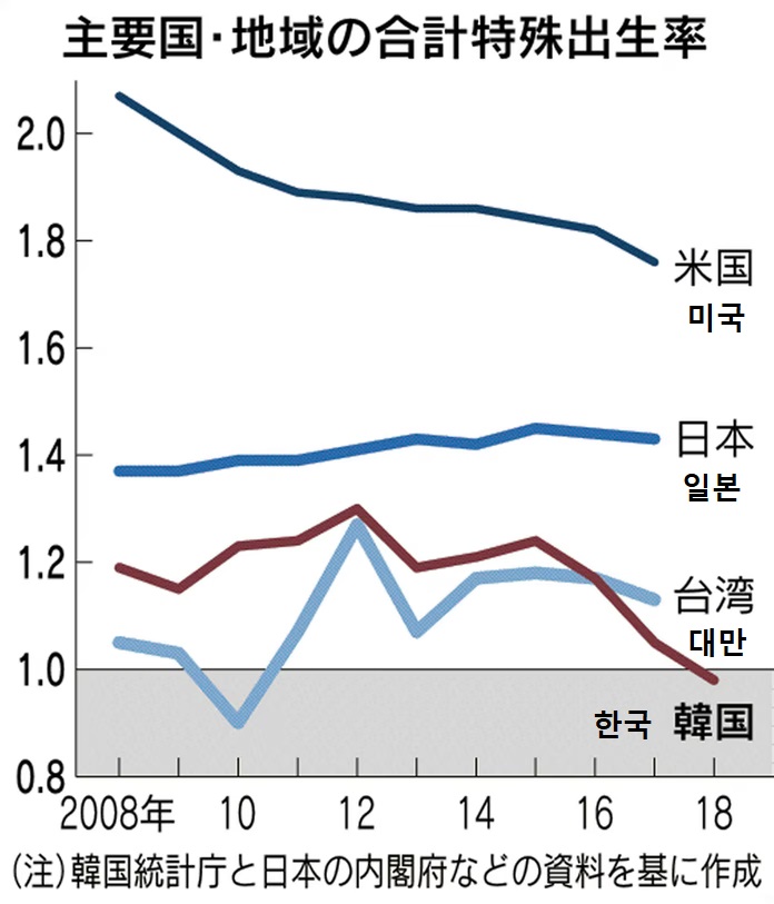 と思ったら、台湾は1年だけ1を割り込んだことがあったんだね。何があったのかしらん。