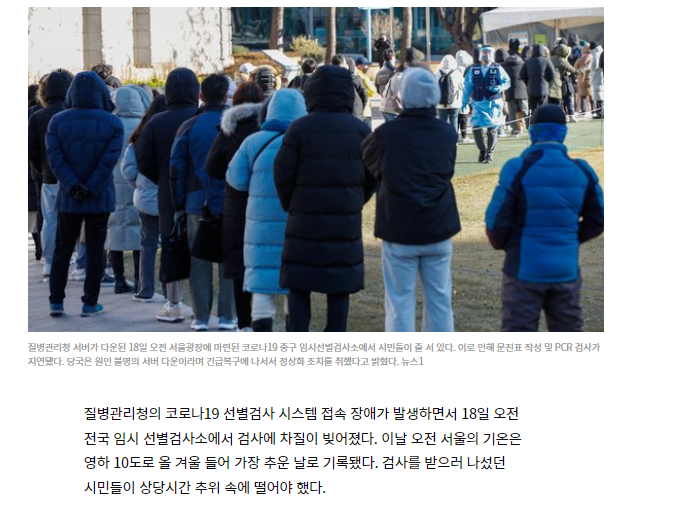 疾病管理庁の「コロナ19選別検査システム」への接続障害が発生したことを受け、18日午前、全国の臨時選別検査所で検査に差し支えが生じた。 同日午前、ソウルの気温は氷点下10度で今年冬一番寒い日となった。 検査を受けに出かけた市民たちは相当時間、寒さの中で震えていた。>>1