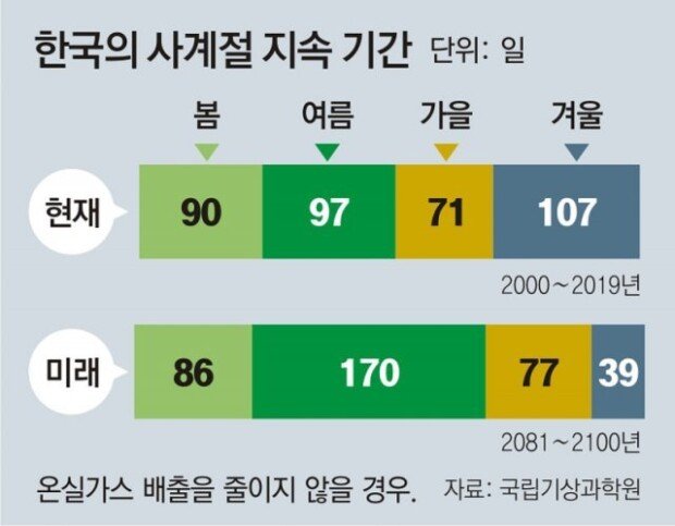 四季は夏中心に再編される。温室効果ガスを減らさなければ、夏は現在(97日)より73日増え、170日間続くものと見られる。冬は現在(107日)より2カ月以上減って39日に止まる見通しだ。気象庁は1日平均気温の変化によって四季を区分する。例えば、1日の平均気温が20度以上に上がった後、下がらなくなった初日を夏の始まりとしている。