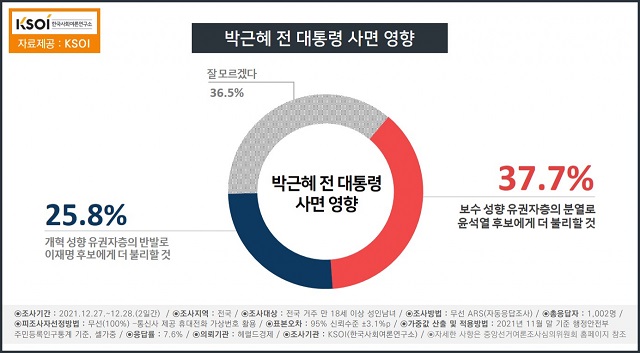 一方「赦免の決定が保守性向の有権者層の分裂により、最大野党“国民の力”のユン・ソギョル(尹錫悦)候補に、より不利に働くだろう」と答えた割合は37.7%を記録した。「よくわからない」と答えた割合は36.5%を記録した。