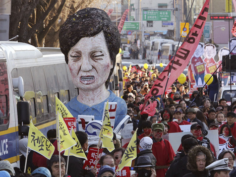 회견 도중에 한명의 시민에 의해 소주병이 투척된다一応元大統領だった女性が肛門まで調べられて投獄って全国民に知られてるとか、もはや廃疾も同然やろ…