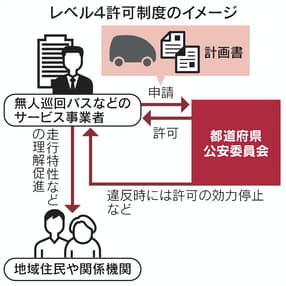 運行許可の対象は、限定された地域で遠隔監視のもと特定のルートを無人走行する巡回バスなどを想定している。政府は2022年度中にも高齢者らの利用が見込まれる地域などで実用化し、25年度をメドに全国40カ所以上に拡大する目標を掲げる。