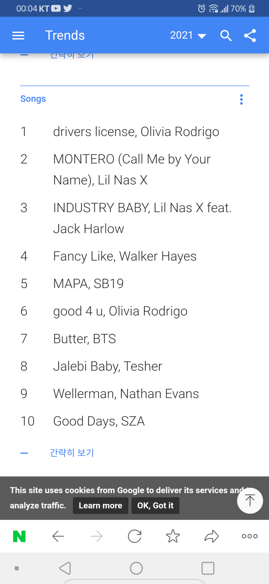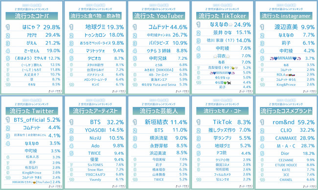 音楽部門には5位にガールズグループFIFTY FIFTY(フィフティーフィフティー)の『Cupid』が、10位にBTSジョングクの『SEVEN』がランキングに記録された。1位は最近人気アニメとショートフォームコンテンツに使われてMZ世代の人気を呼んだ日本の音楽ユニット「YOASOBI」の『アイドル』が占めた。