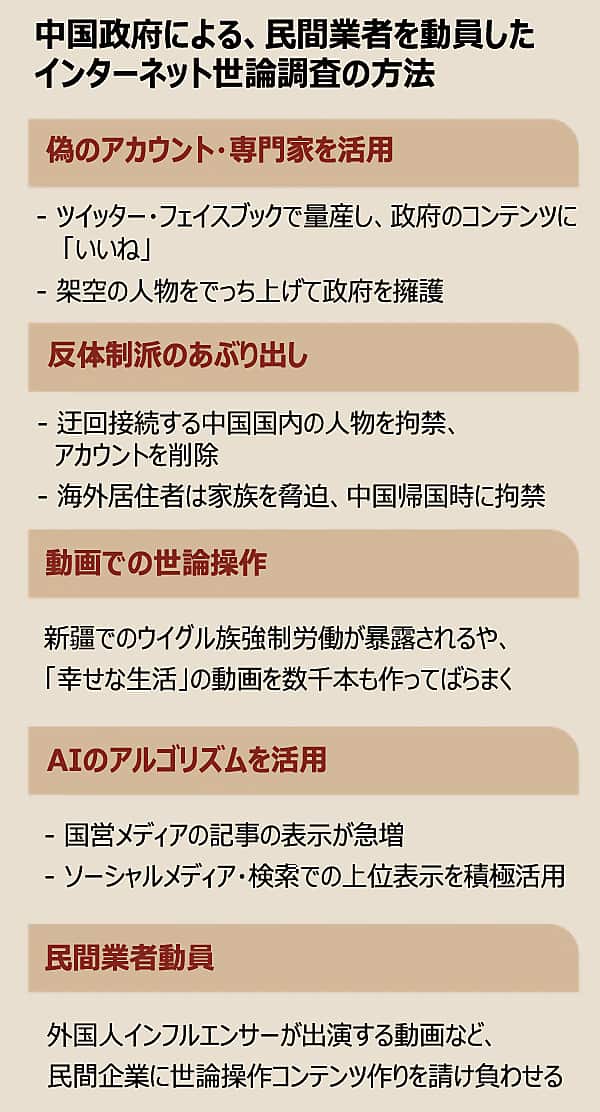 また上海の警察は、海外のインターネットコミュニティーに中国当局が指定する内容を載せ、最上段にコンテンツが見えるようにするサービスを毎月最低10回提供してほしい、と要求した。当局が指定する内容を持つ長さ2-3分の動画を作ることや、ソーシャルメディアに書き込みをする人間の中国国内での情報を提供することも要求した。中国の反体制派は、リアルタイム検閲が行われる自国のソーシャルメディアの代わりに、インターネットに迂回(うかい)アクセスするプログラムを利用してフェイスブックやツイッターに中国政府への批判をアップロードしてきた。海外に滞在する中国人の場合、中国国内にいる家族を圧迫し、コンテンツの削除を要求する可能性がある。