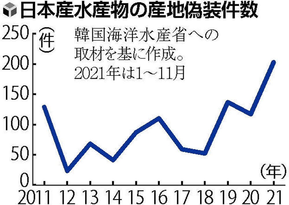 同省によると、傘下の国立水産物品質管理院で把握する産地偽装の件数は11月までに203件を数え、最多だった19年(137件)を大きく上回った。日本政府が4月に福島原発処理水の海洋放出を決定した後、同省が取り締まりを強化し、摘発件数も増えた。