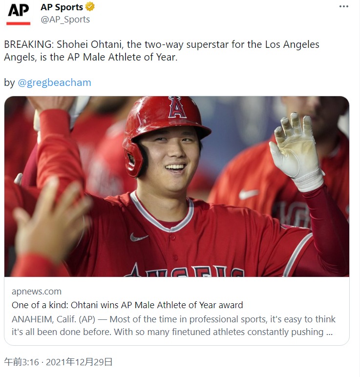 AP通信は'大谷は現代野球を驚くほど再定義した。2021年、世界は大谷を鮮やかに注目した。これがAP通信がLAエンジェルスのツータ兼業スーパースター大谷を選んだ理由」と説明した。