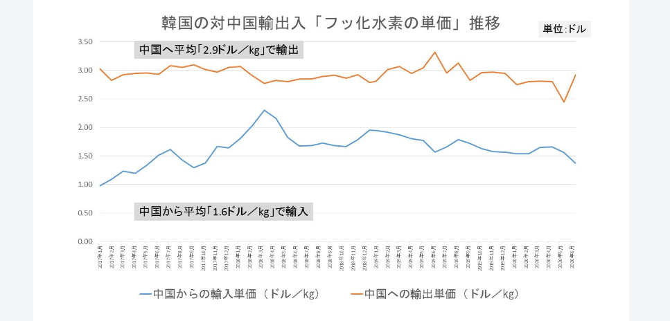 中国へ輸出されるフッ化水素は1kg当たり「2.9ドル」