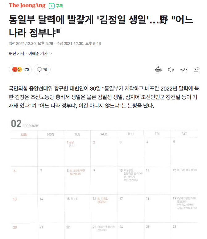 野党「国民の力」中央選挙対策委員会のファン・ギュファン報道官は30日、「統一部が製作して配布した2022年のカレンダーに、北朝鮮の金正恩(キム・ジョンウン)朝鮮労働党総秘書の誕生日だけでなく、金日成(キム・イルソン)誕生日、さらに朝鮮人民軍創建日などが記載されている。どこの国の政府なのか、これは違うのではないか」との論評を出した。