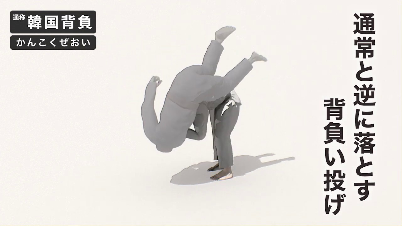 <6>逆背負い投げ 通常の背負い投げと逆に落とす投げは技の認定をされず、指導に。いわゆる「韓国背負い」などが対象になると見られる。