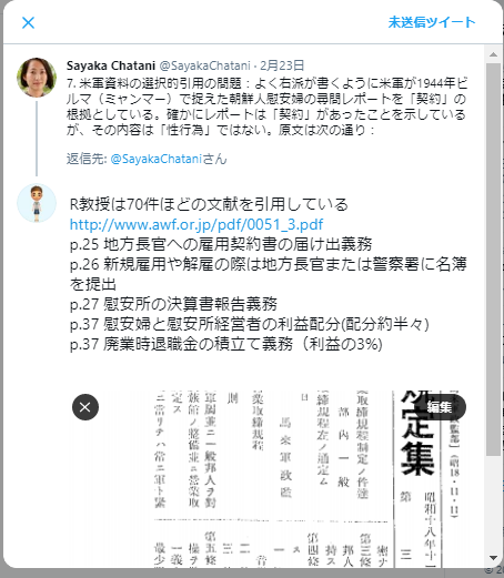 {公娼制度研究の小野沢あかね・立教大学教授は「娼妓契約は事実上の人身売買であり、軍の関与では異なるが、『慰安婦』制度とともに性奴隷制度」としたうえで「『慰安婦』は公娼だったから被害者ではない」とするラズマイヤー教授の論法は「著しく低い人権意識を表す」と批判した。}>>495