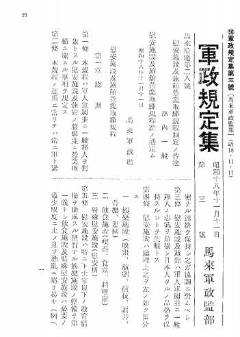 他にも 色々あるが ラ氏の論文にもある イヨンスの証言を検証するべきだと思います太平洋戦争中、陸軍占領地であるマレー・スマトラ両地区(シンガポールを含む)の軍政に当たるため1942年7月に第25軍軍政監部が編成された。翌1943年5月の第25軍(および軍政監部)スマトラ移駐に際して、マライ(馬来)地区(1942年12月の閣議で、旧英領マレーをマライ(馬来)と改称されることが決定)の軍政を専担する南方総軍直隷の組織として馬来軍政監部がシンガポール(昭南)に新設された。本部組織は総務、警務(のちに治安部)、産業、財政、会計監督、宣伝の各部からなり、外局として鉄道、海事、電政、郵政、放送管理の各局を置いた。1943年9月の日タイ条約により管轄下にあった3州がタイ国に編入されたため、馬来軍政監部の管轄区域は大幅に縮小された。1944年1月には、第29軍編成とともに馬来軍政監部は第29軍に付置され、本部をシンガポールからタイピンに移転した。軍政要員は1942年3月末で436人だったのが、1944年3月時点ではマレー・スマトラ地区あわせて3986人(うち高等文官815)の規模に膨張した。