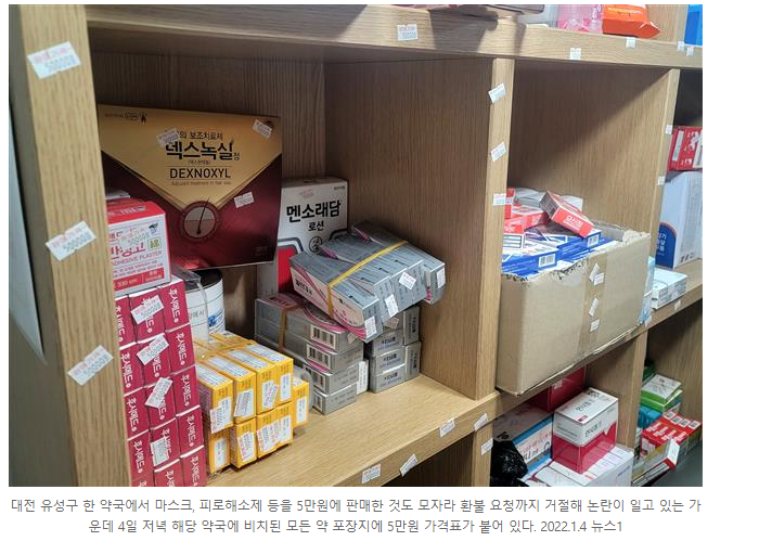 大田儒城区のある薬局でマスク、疲労解消剤などを5万ウォンで販売しただけでは足りず、払い戻しの要請まで断って論争が起きている中、4日夕方、該当薬局に備えられたすべての薬の包装紙に5万ウォンの値札が貼られている。- 17