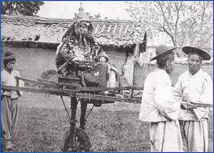 で、車輪が小さくて乗り心地が悪いだろう。サスペンションも付いてないから、四人いるなら、日本の篭のように担いだ方が乗り心地が良いと思うんだけど?