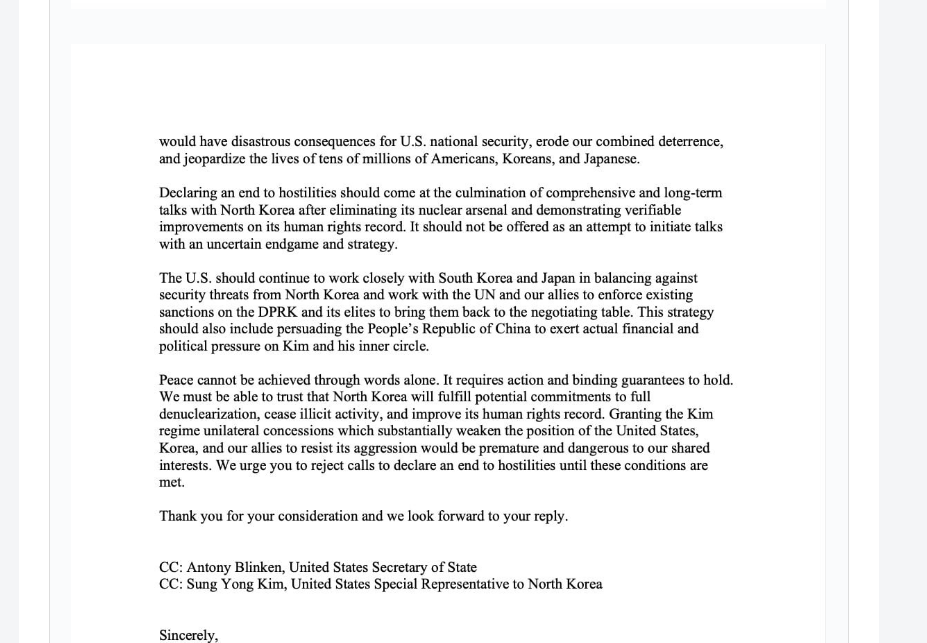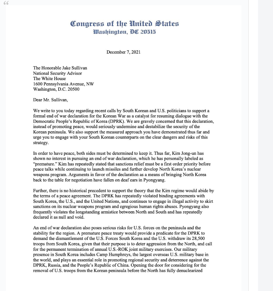 「米議員が終戦宣言に強い反対表明」韓国は高いロビー費を払って、不可能なことをしようとしてる。