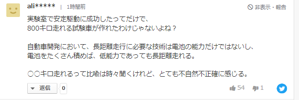充電に何時間かかるのか書いていないし、電池のサイズと重さが示されていないので、この記事の質がわかります。800キロじゃなくて800メートルの間違いだろwww