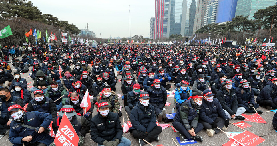 >全国民衆行動(民主労働組合と農民と貧困層で構成)は、午後2時、ソウル汝矣島(ヨイド)公園で「2022民衆総決起大会」を開き「ろうそく政府を自任した文在寅政権に期待もしたが、彼らもやはり私たちの期待を裏切った」と主張した。