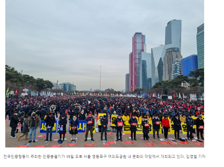 全国民主労働組合総連盟(民主労総)など進歩団体は15日、ソウル永登浦汝矣島(ヨンドゥンポ·ヨイド)一帯で1万5000人余り(主催側推算)が参加した大規模集会を開催した。 ソウル市と警察は集会を許可しなかったが、彼らは集会直前に突然場所を公開する方式で集会を開いた。 警察と参加者の間で衝突はなかった。
