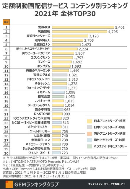 2021年の年間総合ランキング1位はアニメ『鬼滅の刃』が獲得。2021年上半期の総合ランキングでは『呪術廻戦』が1位に入ったが、年間では『鬼滅の刃』が上回った。テレビアニメ版「無限列車編」の放送・配信が始まった10月以降に伸びを見せている。続く2位が『呪術廻戦』、3位に『東京リベンジャーズ』と、2021年に劇場版が公開されて話題度が高まったコンテンツが多く視聴されている。