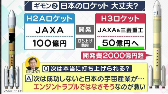 H3の打ち上げ費用=50億円 ←低コスト、H2Aの約半分の費用