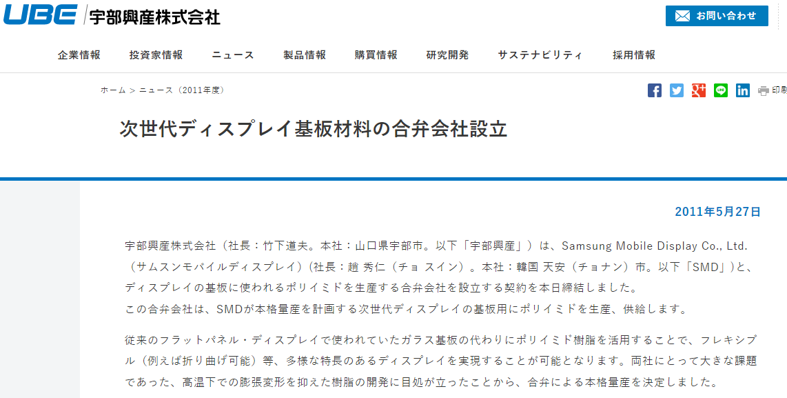 宇部興産、Samsungと折り曲げディスプレイ材料で合弁