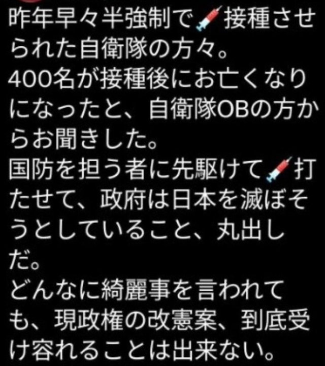 また、この日本においても自衛隊の隊員たちがワクチンを強制的に接種させられたことが判明していますが、これもまた、日本の国力低下を狙った計画である可能性が高いと言えます。