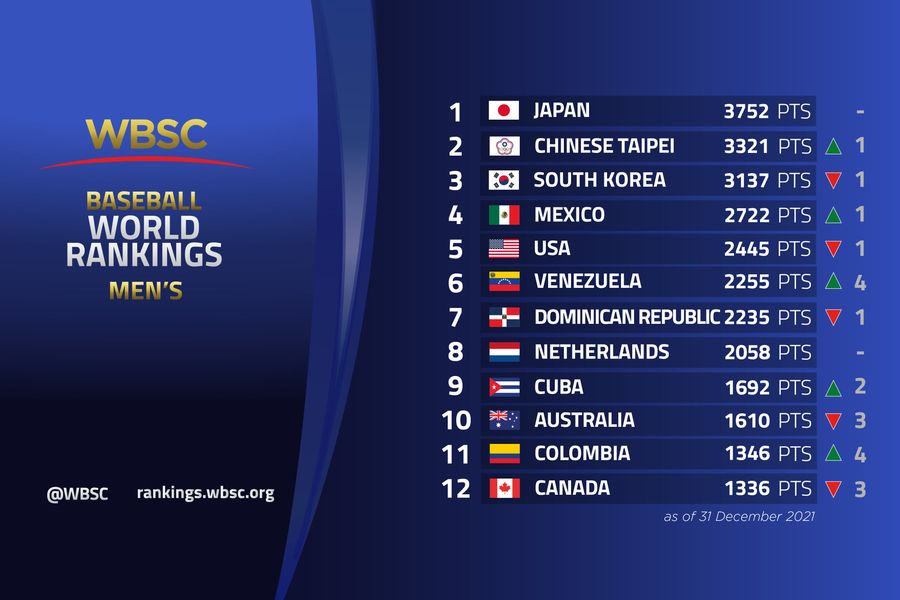 WBSCは21日(日本時間)、2021年最終順位を公開。世界ランキングは、直近4年間WBSCが承認した12歳以上の代表チームが参加する国際大会の成績をもとにしている。今回の順位は2018年WBSC承認国際大会の成績で、2017年のポイントが満了したため順位に変動があった。