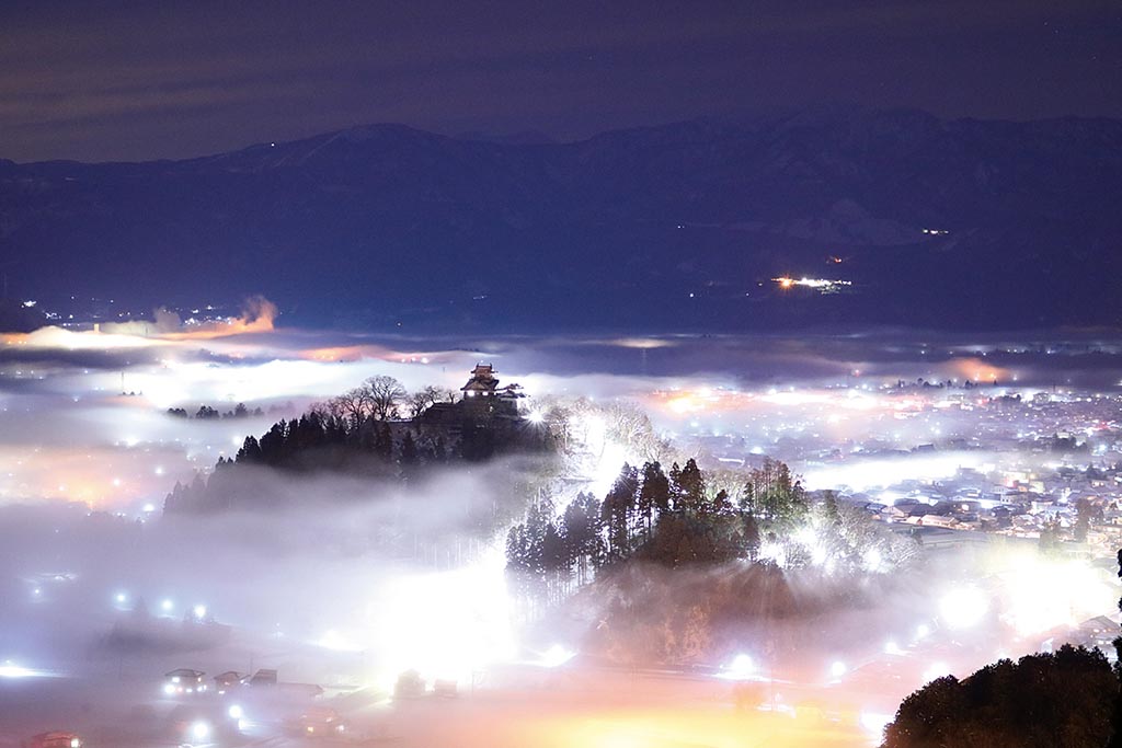 ここも「天空の城」と呼ばれる城の一つ。波打つ雲海に復元天守がそびえ立ちます