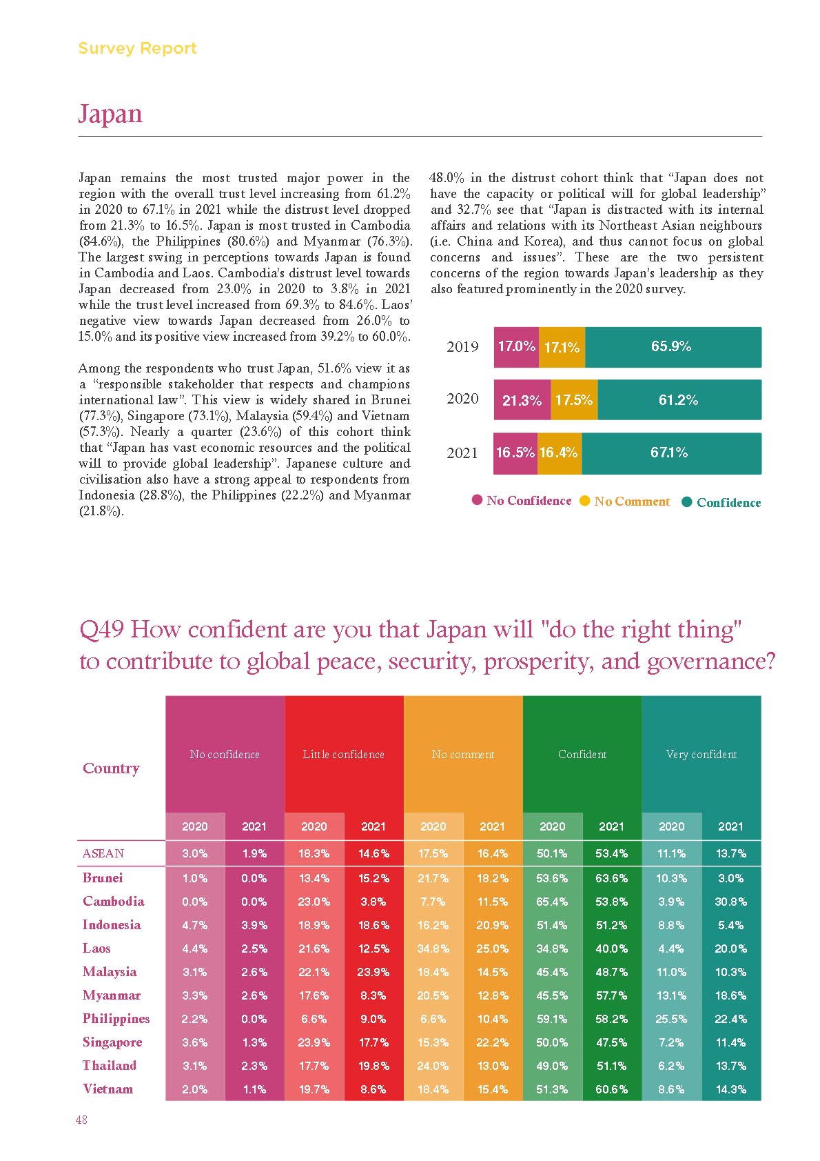 Japan remains the most trusted major power in the region with the overall trust level increasing from 61.2% in 2020 to 67.1% in 2021 while the distrust level dropped from 21.3% to 16.5%. Japan is most trusted in Cambodia (84.6%), the Philippines (80.6%) and Myanmar (76.3%).