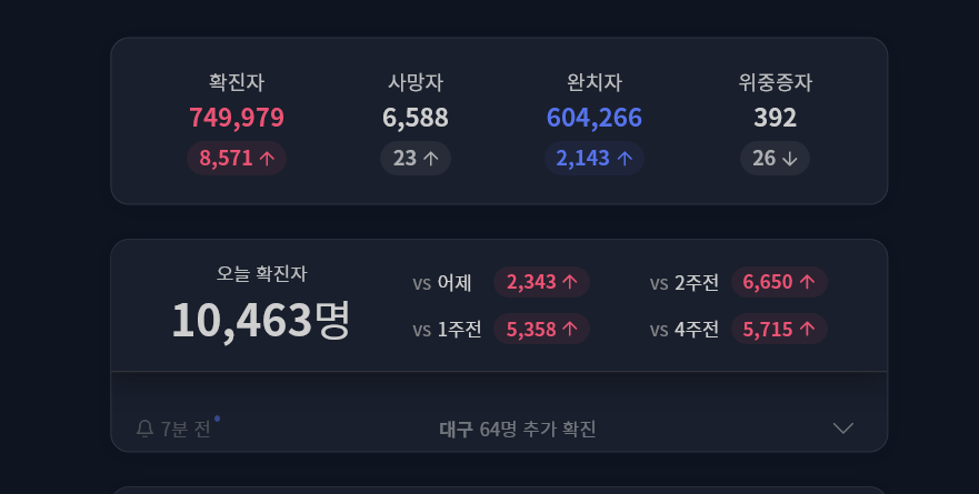社会福祉部中央事故収拾本部の孫映レ(ソン・ヨンレ)社会戦略班長は25日午前、CBSラジオ番組『キム・ヒョンジョンのニュースショー』に出演し、この日感染者数が初めて8000人を突破したことについて「今後も増加を続けるだろう」としながら「今後2~3週間あるいは2月内におそらく2~3万人程度、あるいはそれ以上にもなるかもしれないとみているところだ。オミクロン株はデルタ株よりも拡散速度が2~3倍になるので感染者の増加は避けられない」と明らかにした。- 16