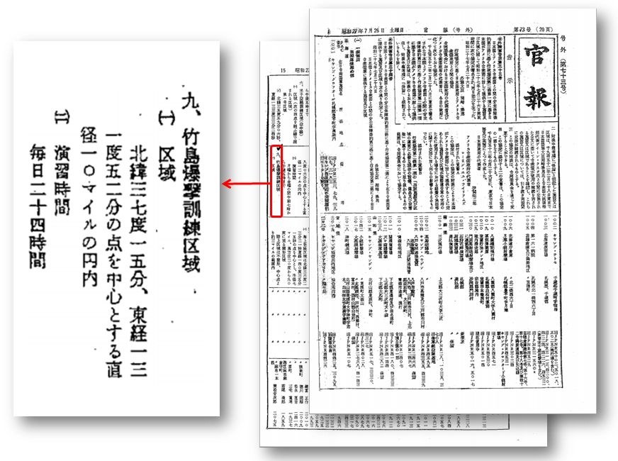 2.サンフランシスコ平和条約発効直後の1952(昭和27)年7月,米軍が引き続き竹島を訓練区域として使用することを希望したことを受け,日米行政協定(注:旧日米安保条約に基づく取極。現在の「日米地位協定」に引き継がれる。)に基づき,同協定の実施に関する日米間の協議機関として設立された合同委員会は,在日米軍の使用する爆撃訓練区域の1つとして竹島を指定するとともに,外務省はその旨を告示しました。
