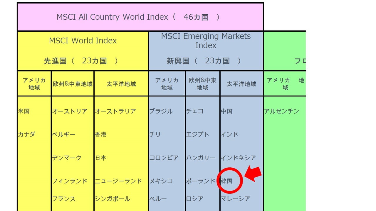 どっちがいいんだろうな。先進国指数連動のファンドの資金が新興国指数連動のそれの4倍以上と言っても、先進国指数の構成において韓国の占める割合が低いので、韓国株を真面目に買い揃えずとも指数連動性を保つことはできる。