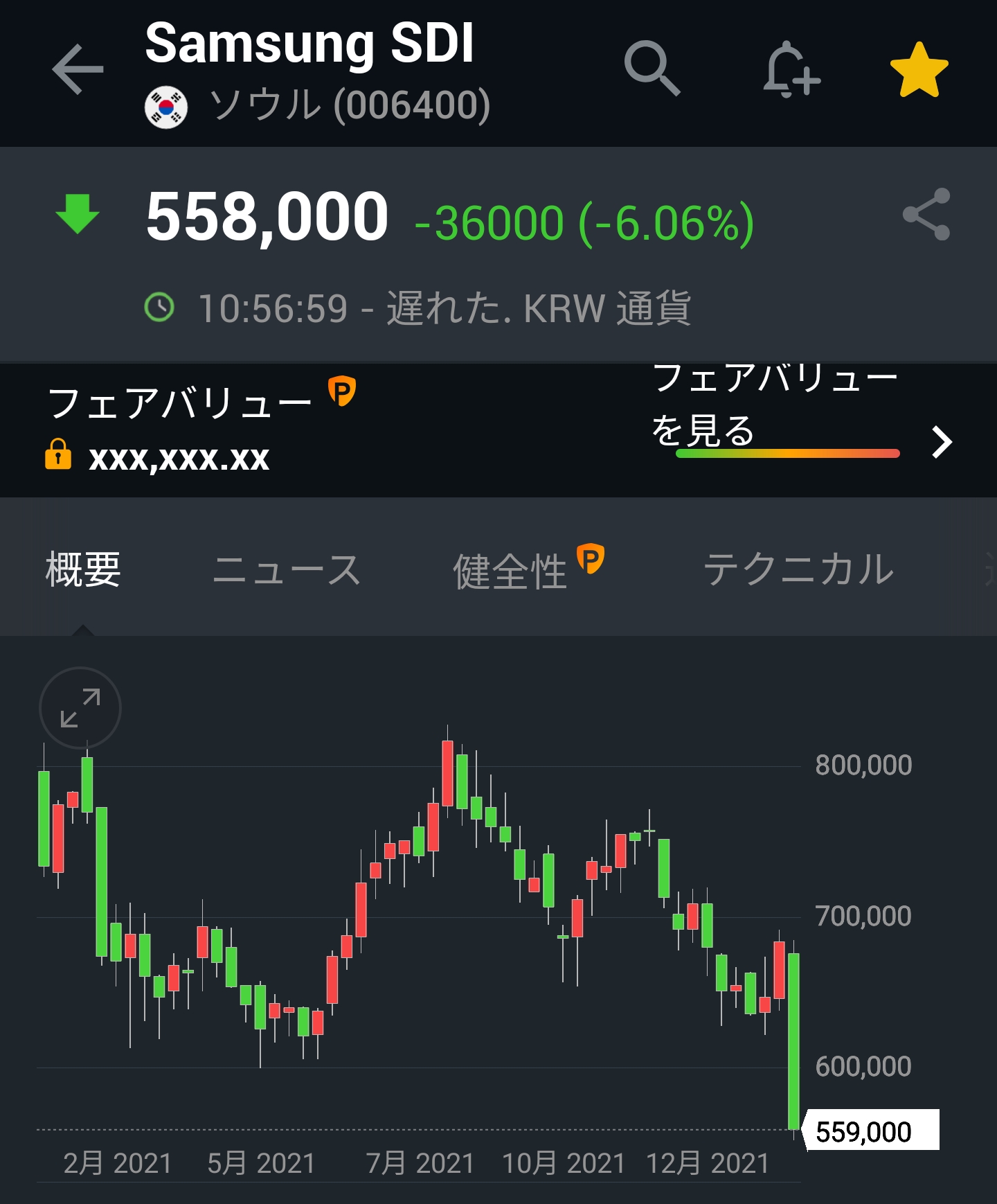 SAMSUNG株価 7万ウォンを一時的に割り込む
