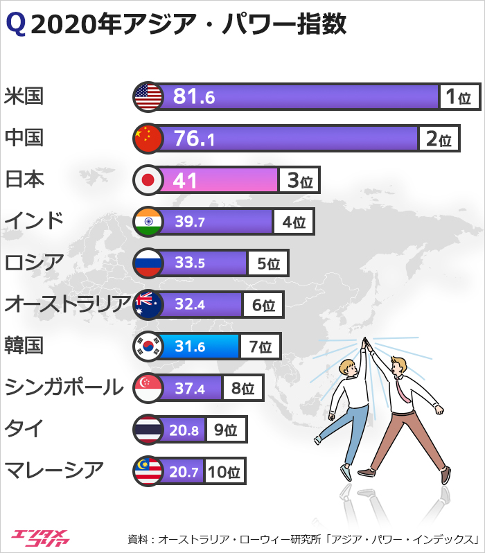 アジア・パワー・インデックスは経済資源や関係、軍事力および国防ネットワーク、外交・文化的影響力、復元力や未来資源など八つのカテゴリーの128の指標を活用し、26カ国・地域を対象にアジアに影響力を及ぼすランキングを付けている。