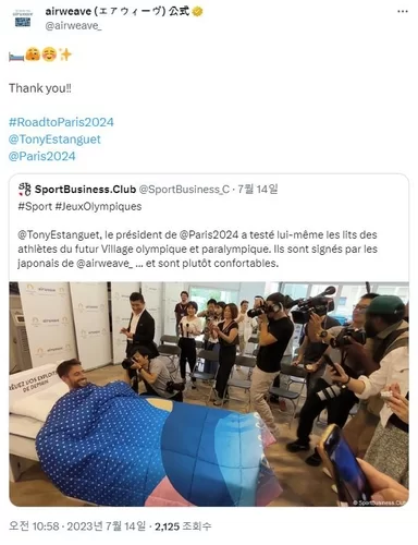 에어위브는 파리 올림픽 선수촌, 패럴림픽(장애인 올림픽) 선수촌과 미디어빌리지 등 올림픽·패럴림픽 참가자들이 머무는 숙소에 침대와 매트리스 1만6천개를 내년 3월∼6월 배송할 예정이다. 대회가 끝나면 파리 올림픽·패럴림픽 조직위는 이 침대를 자선 단체에 기부한다.