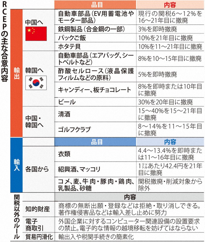 RCEPに署名した15か国の域内人口は約23億人、国内総生産(GDP)は約26兆ドルで、いずれも世界の約3割を占める。批准手続きを終えた国から先行して関税が撤廃・削減され、投資などについての共通ルールも適用される。