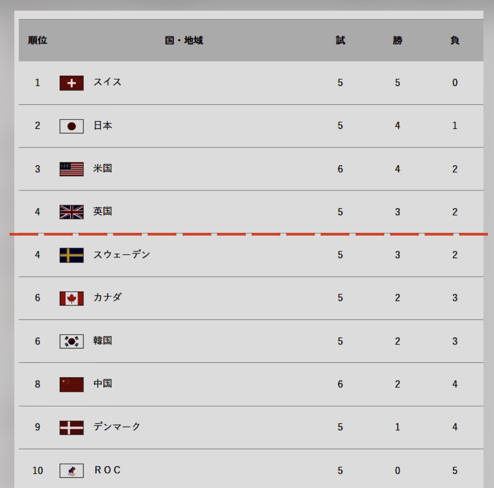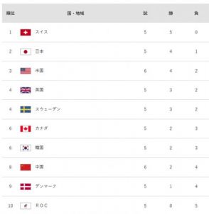 https://gorin.jp/game/CURWTEAM4-------------/result/カーリング、今やってるのは予選で、上位4チームが準決勝へ進む。準決勝の敗者は3位決定戦に回り、5位以下の順位は1次リーグの成績で決まる。ということです。