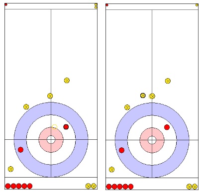 第14投でセンターラインの黄色のガードストーンを回り込んで1番目の石を作るショットがショートして手前で止まってしまた。