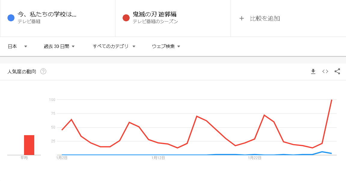 数値で比較すると『今、私たちの学校は...』100に対して、『進撃の巨人』が42(33+9)。1/2以下です。