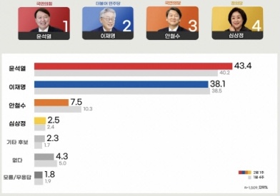 あいつら粛清だなw韓国大統領選候補支持率 李氏40.4%・尹氏38.5%・安氏8.2%