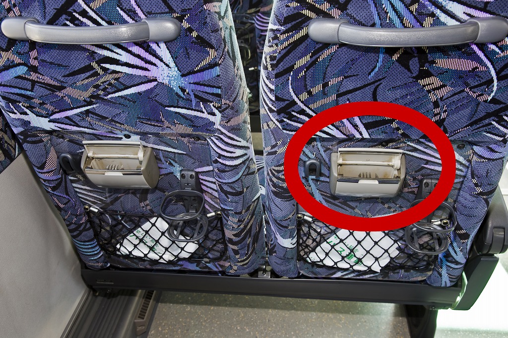 画像のような灰皿がついてました。今はもちろん、ほとんどのバスで最初から灰皿が存在しません。
