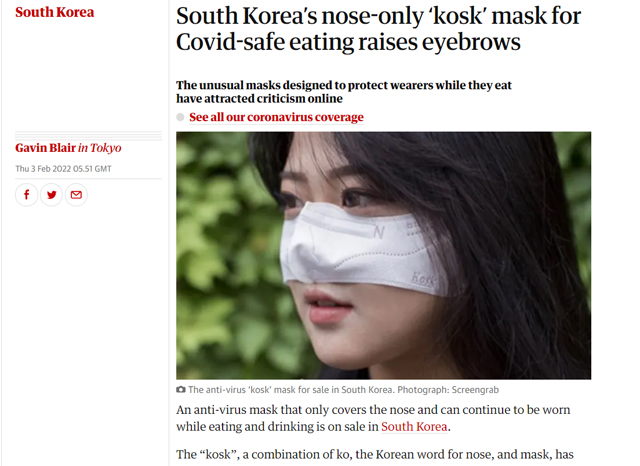 現地時間の3日、英・The Guardianは、コスクは韓国語で鼻を表す「コ」と「マスク」の合成語であることを説明し、一番大きな用途はレストランやカフェで食べたり飲んだりする時だと紹介した。