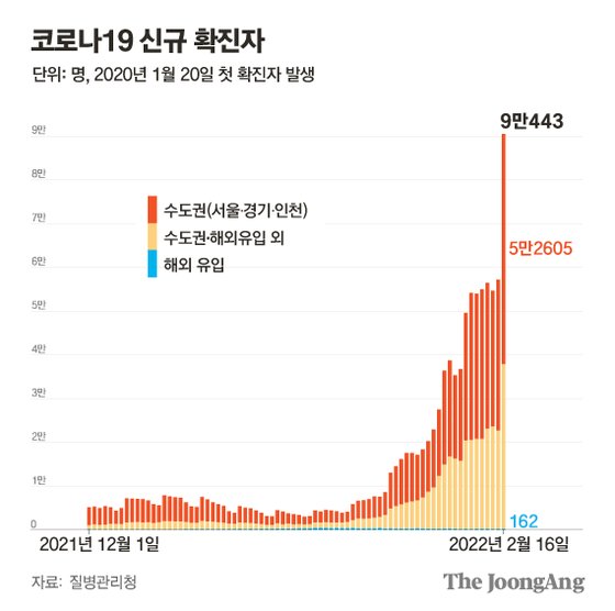 韓国国内でオミクロン株が広がり、新型コロナ新規感染者数が9万人台にまで増えた。前日の5万人台からわずか一日で3万人以上も急増し、この傾向なら近く10万人を大きく超えると予想される。