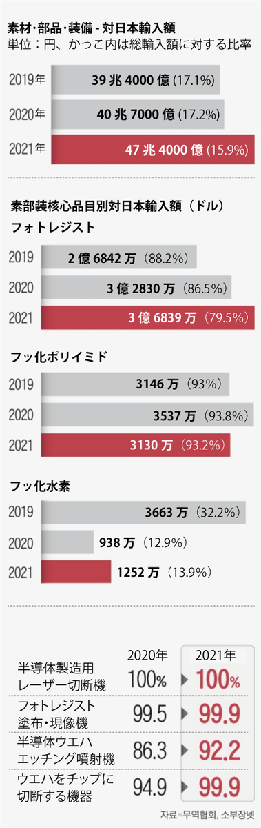 2018年の対日本素部装の輸入額は381億ドル(45兆7000億ウォン)だった。2019年に日本が経済報復措置を断行すると輸入額は329億ドルまで低下した。しかし翌年には340億ドルに反騰し、昨年は395億ドルに上がった。