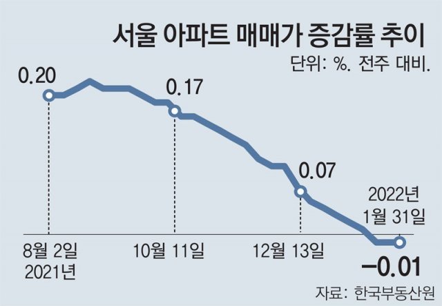 京畿道や仁川市も、前週比それぞれ0.03%と0.04%下がり、2019年8月以降初めて下落に転じた。華城(ファソン、マイナス0.09%)や安養(アンヤン、マイナス0.07%)、南楊州(ナムヤンジュ、マイナス0.07%)などが下落傾向を主導した。