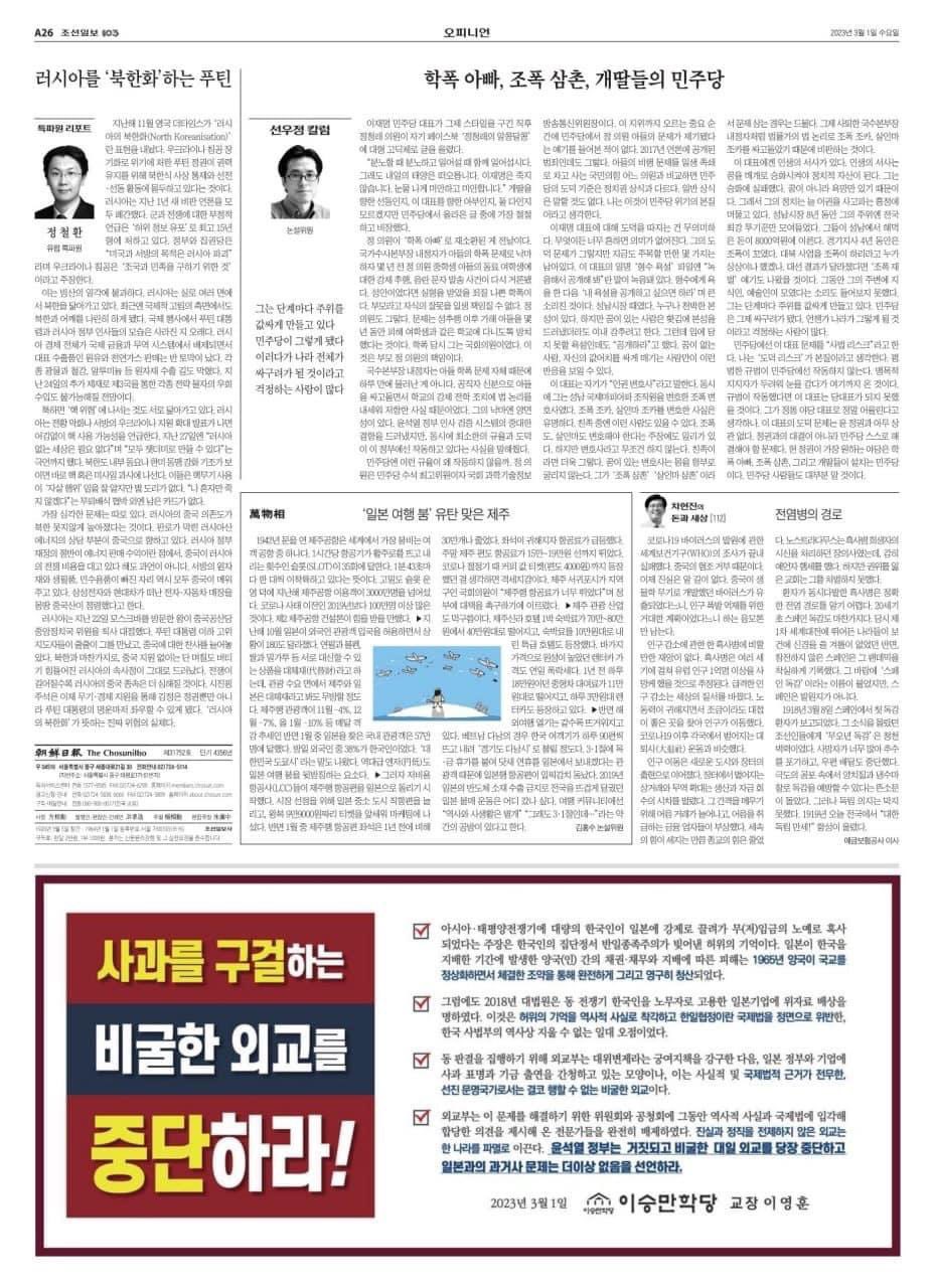 朝鮮日報のオピニオン面に掲載された意見広告はこんな刺激的な見出しを掲げている。
