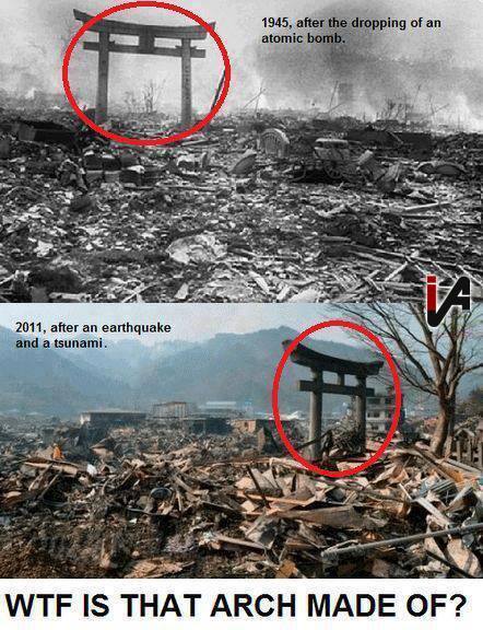石だから燃えなかっただけ細くて重いから爆風や津波の影響をあまり受けなかったんだろ