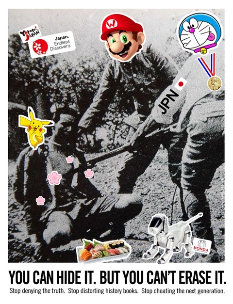 かつて日本の残酷な侵略蛮行の様子が写された白黒写真の上にキャラクターのピカチュウや桜のステッカーがところどころにつけられている。